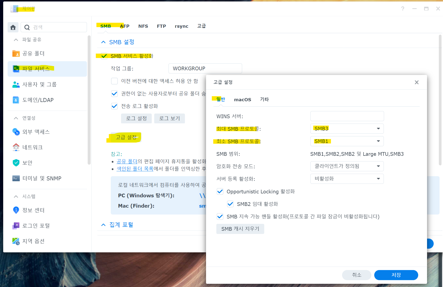 DSM-제어판-파일서비스-SMB-SMB서비스 활성화-고급설정-일반