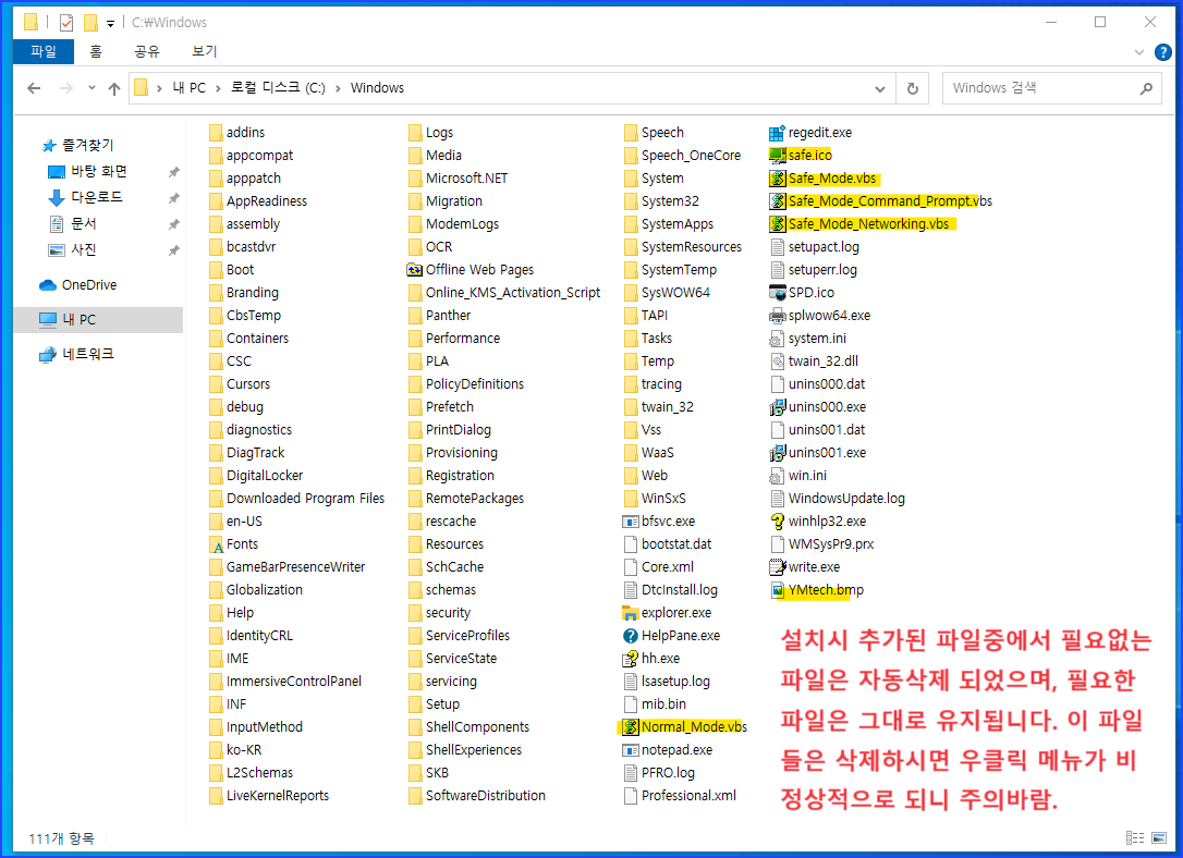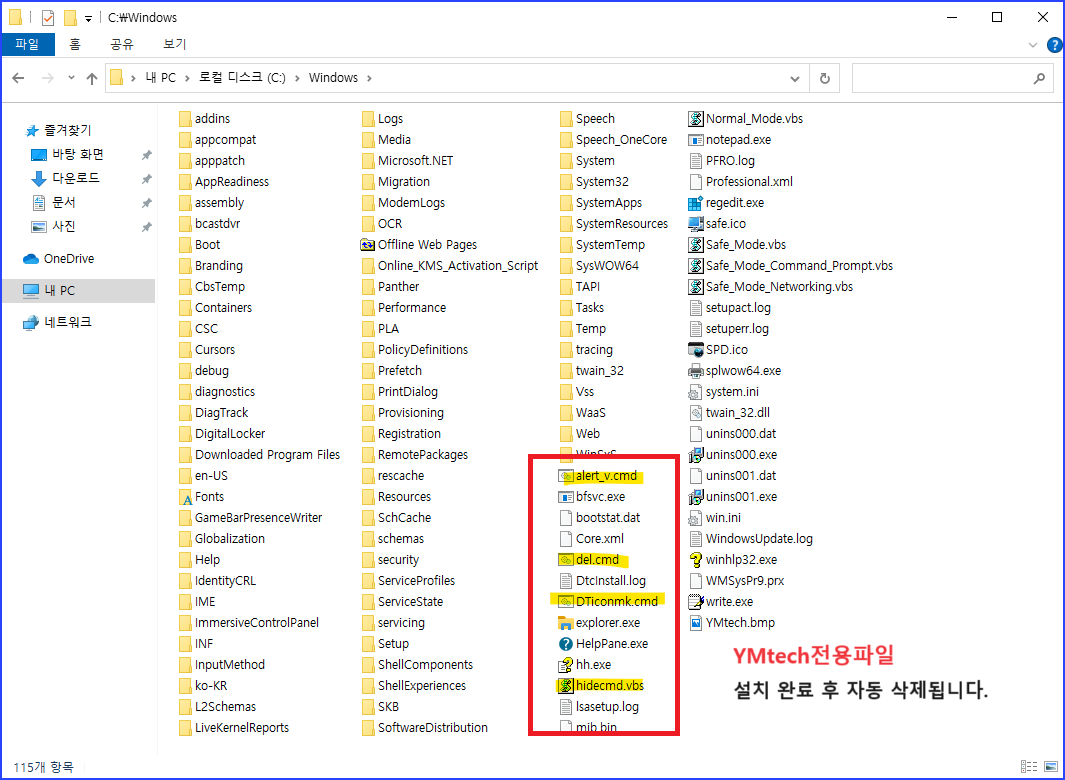 22. 윈도우10이 설치된 후 Windows 폴더 내부에 YMtech_USB 설치흔적 파일이 남아 있습니다.