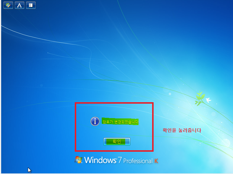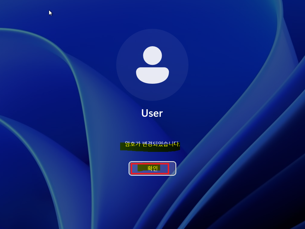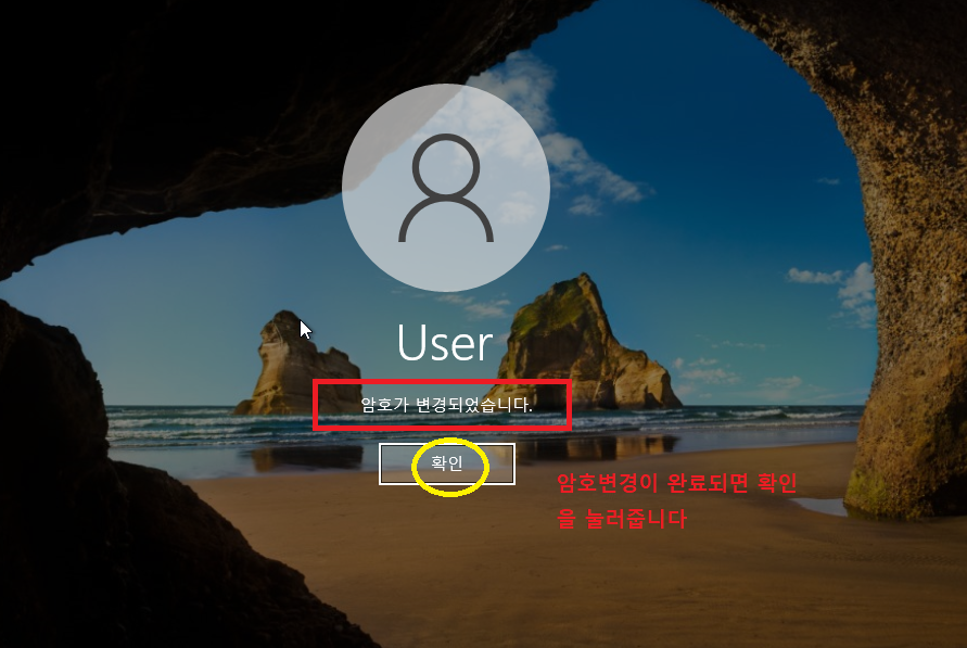 아래 화면처럼 "암호가 변경되었습니다" 라는 알림이 보이면 "확인"을 눌러 줍니다.