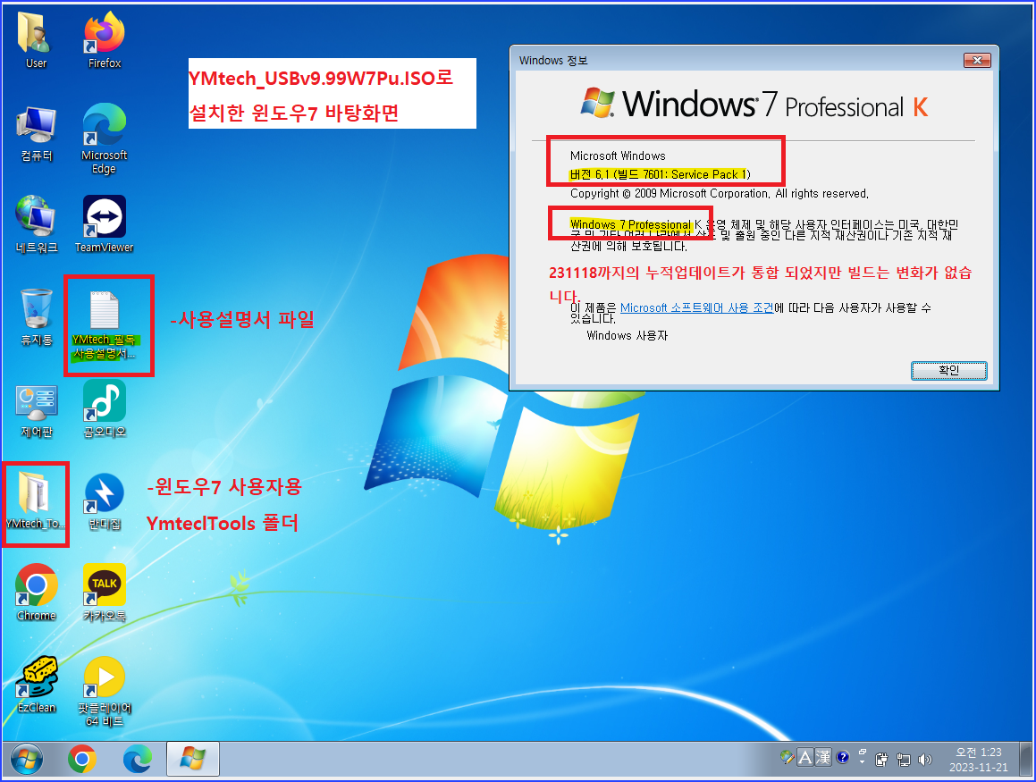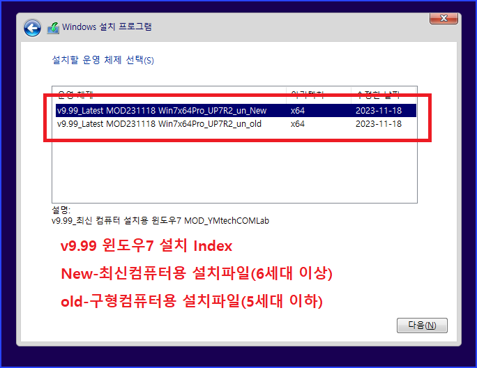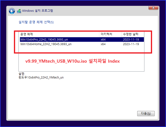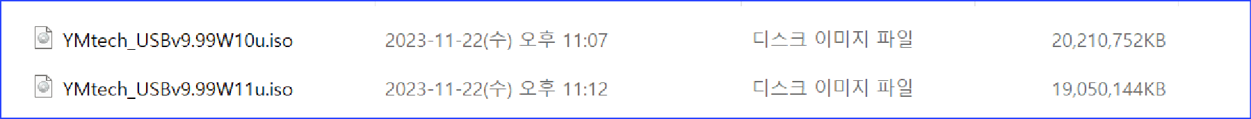 이제 거의 5년여동안 윈도우 설치이미지 커스텀작업을 통해서 만들어진 버전이 현재 23년11월 기준으로 v9.99까지 만들어졌으며, YMtech_USBv9.99W1x.iso 라는 기본파일명으로 배포하고 있습니다.