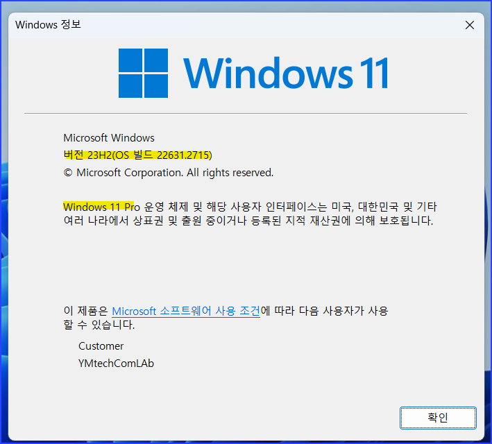 1. Win11_23H2_22631.2715 빌드의 누적업데이트 적용 완료: Home & Pro 2index