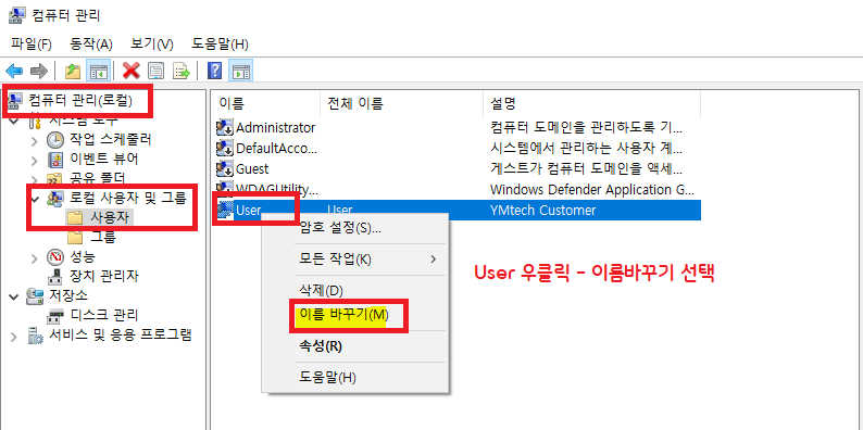 컴퓨터관리에서 로컬 사용자 및 그룹-사용자-를 선택 후 User 계정을 우클릭 후 이름 바꾸기를 눌러 줍니다.