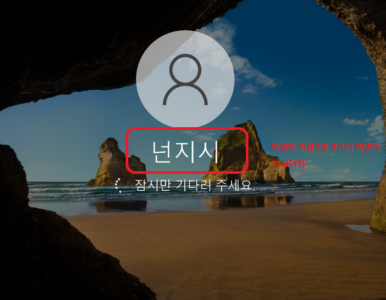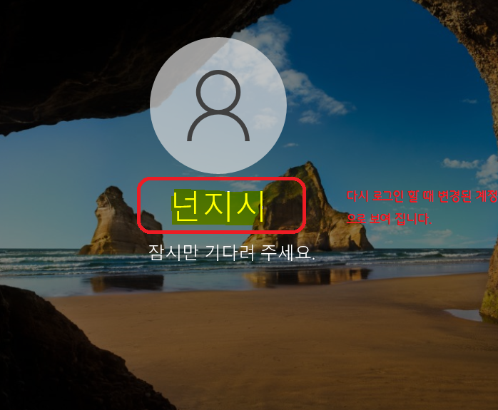 19. 다시시작 후 로그인 화면에서 변경된 사용자 이름이 보이는 것을 확인 할 수 있습니다.