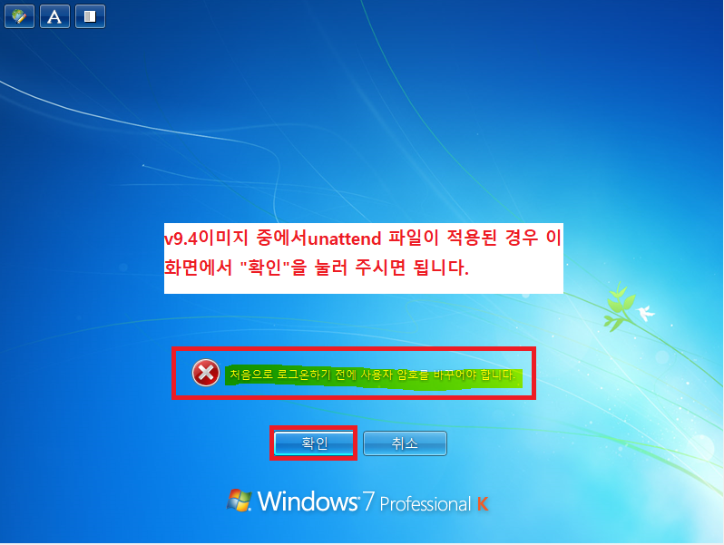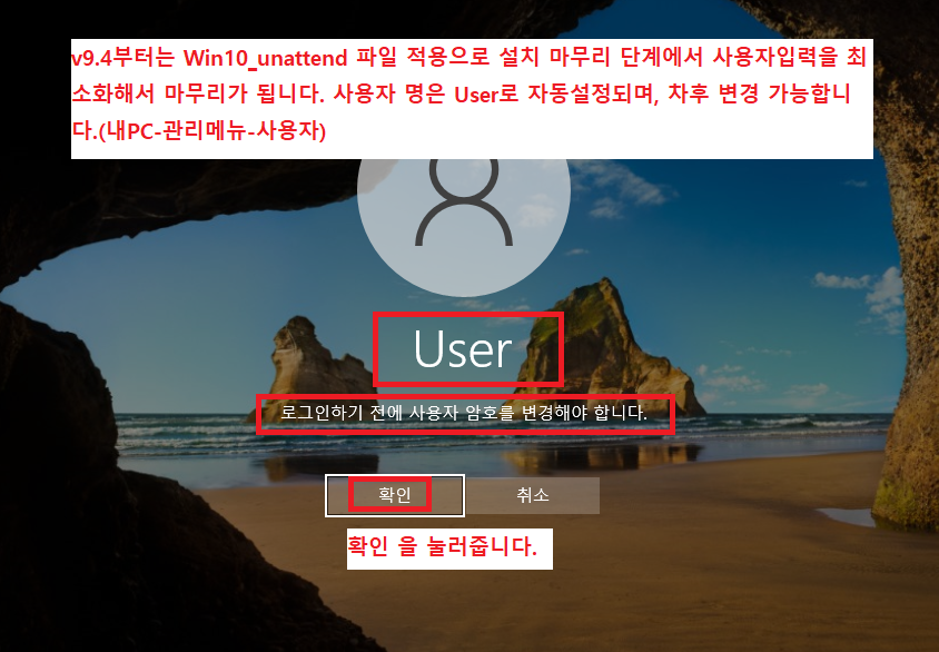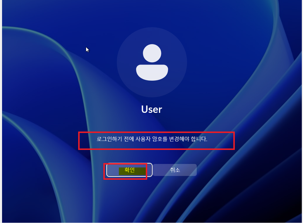 4. 사용자 이름이 User로 자동입력 된 후 아래 사진처럼 "로그인하기 전에 사용자 암호를 변경해야 합니다." 라는 알림이 출력되면 "확인"을 눌러 줍니다.