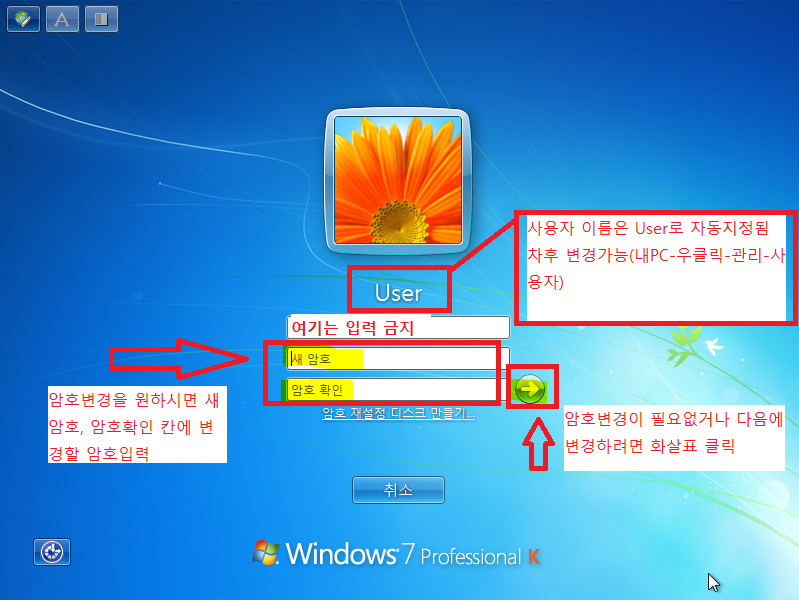 설치과정은 이전 버전과 차이가 없으며 unattend.xml 파일 적용으로 마무리 단계에서 사용자 계정이 User로 자동입력 됨으로 그 부분만 참고 하시면 됩니다. 사용자 계정과 암호는 차후 수정가능합니다.