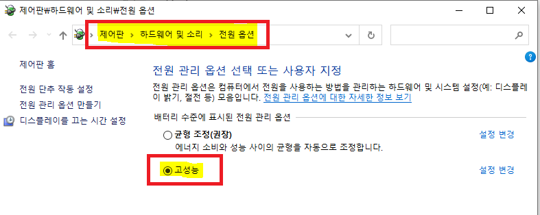 저사양 PC에서 고성능으로 선택 해 주시고, 노트북에서는 균형조정을 사용하시면 베터리를 절약할 수 있습니다.