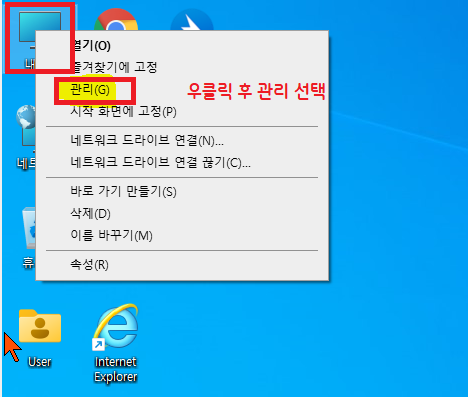 바탕화면 내PC-우클릭 후 관리 메뉴를 선택합니다.