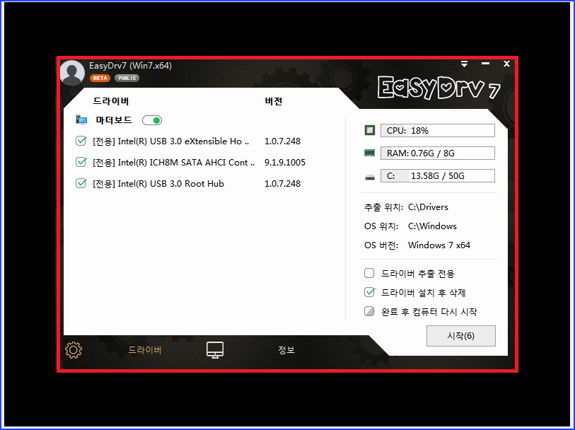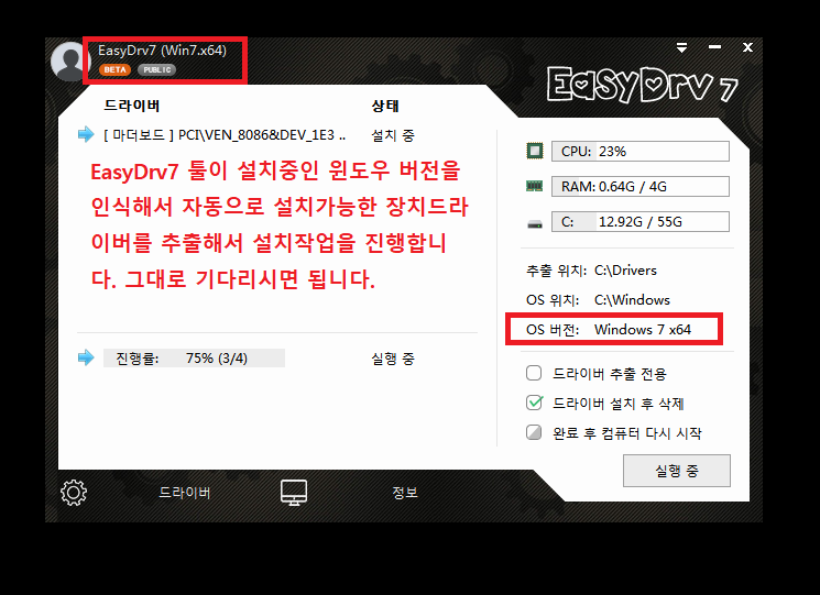 -v9.1버전까지는 윈도우10의 경우 EasyDrv7 실행이 백그라운드에서 진행이 되었으나, v9.3 부터는 스크립트 수정으로 설치과정을 확인 할 수 있도록 변경되었습니다. 저는 드라이버 설치과정이 보이는 게 더 좋은 거 같습니다. ^^