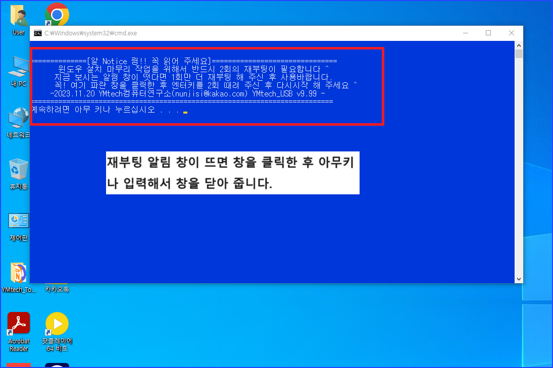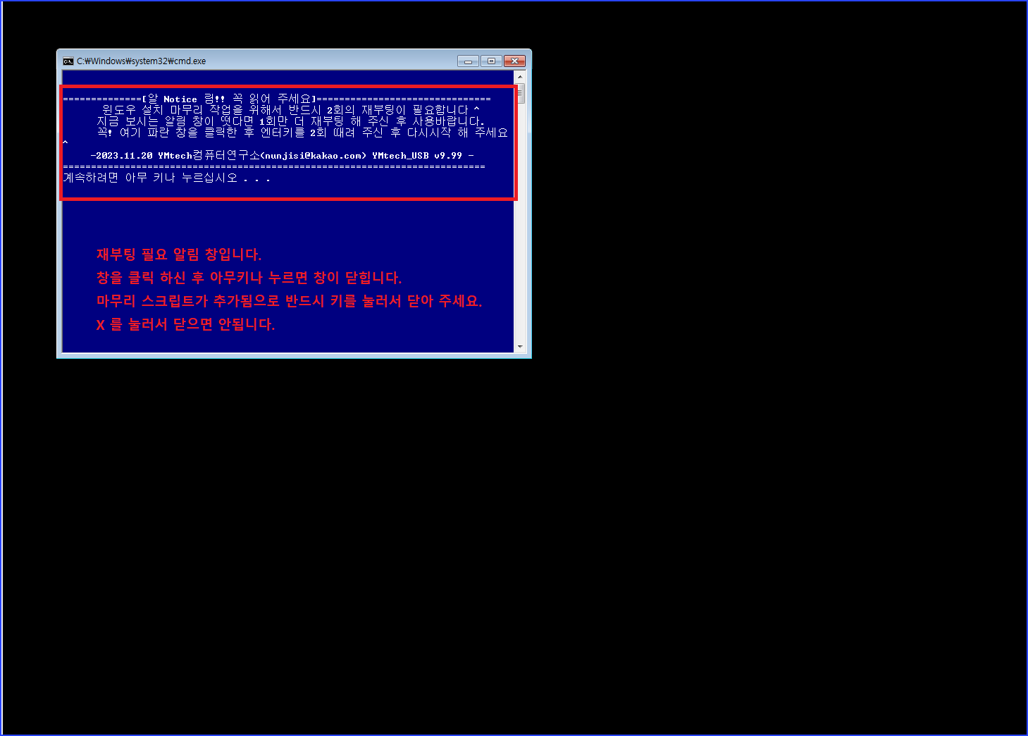 - 이 알림이 보이면 내용을 읽어 보신 후 (파란색 창을 클릭 한 후 ) 아무키나 두 번 누른 후 , 창이 닫히면 1회 더 다시시작 해 주시면 됩니다.