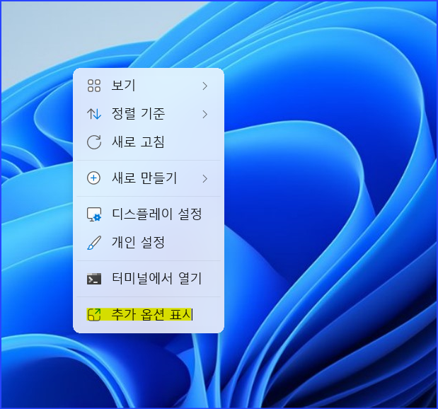 1) 윈도우11에서는 바탕화면에서 우클릭 시 아래와 같이 메뉴 하단에 "추가옵션표시" 를항목이 있습니다.
