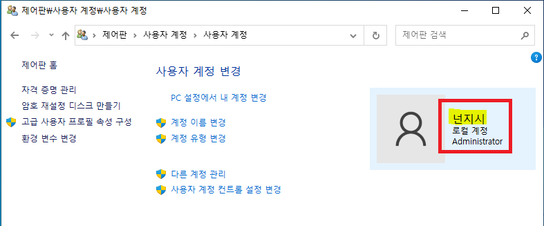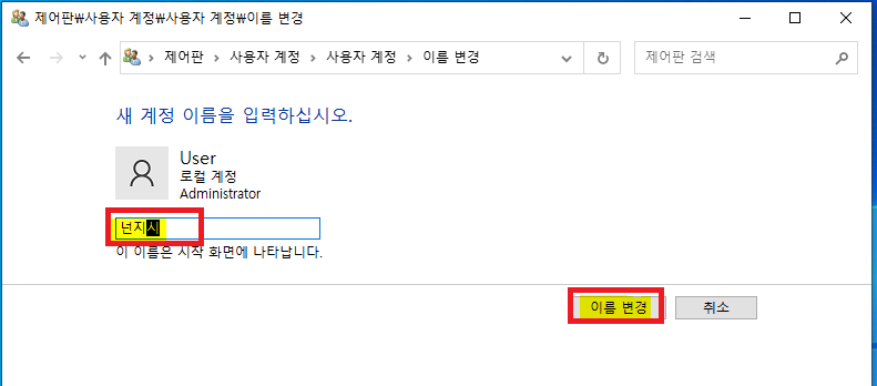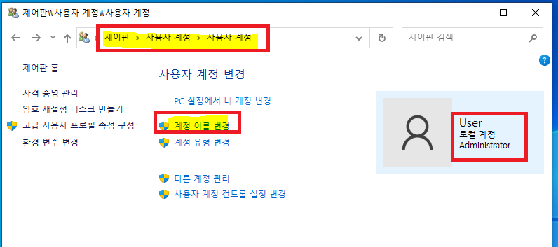 제어판-사용자계정-사용자계정변경 으로 들어가서 "계정이름변경"을 선택합니다.