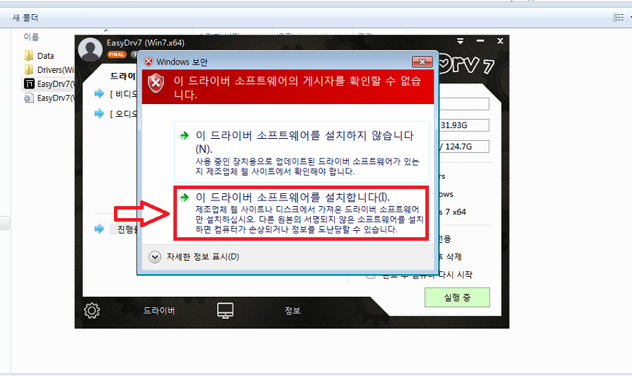 -원인:설치 마무리 단계에서 EasyDrv7이 자동 설치스크립트로 실행이 되어야 하는 데 자체적인 오류로 실행되지 못할 때 발생됨