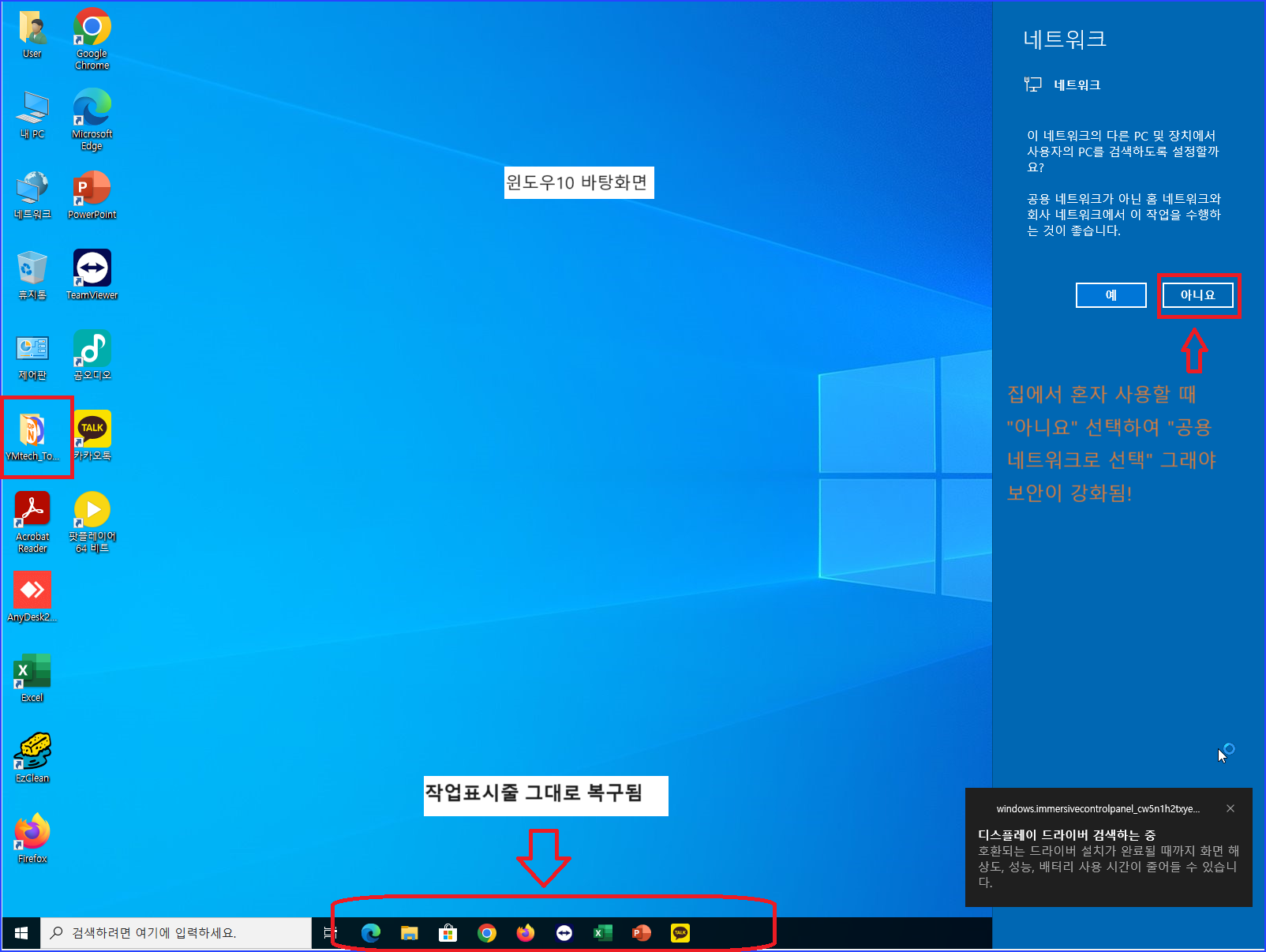 - 우측 네트워크 선택 항목이 보일 경우 네트워크 공유 기능(폴더공유, 프린터 공유 등)을 사용 하지 않는 경우에는 [아니오]를 선택하고 사용 중 인 환경에서는 [예]를 선택 해 주시면 됩니다. 이 설정은 다시 변경 가능합니다.
