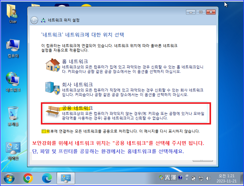 - 네트워크 접속환경 "공용네트워크"로 설정: 보안강화