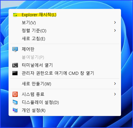 먼저 우클릭메뉴 추가옵션표시로 들어가서 Explorer 재시작을 선택 해 주시거나 윈도우를 다시시작 해 주시면 적용됩니다.