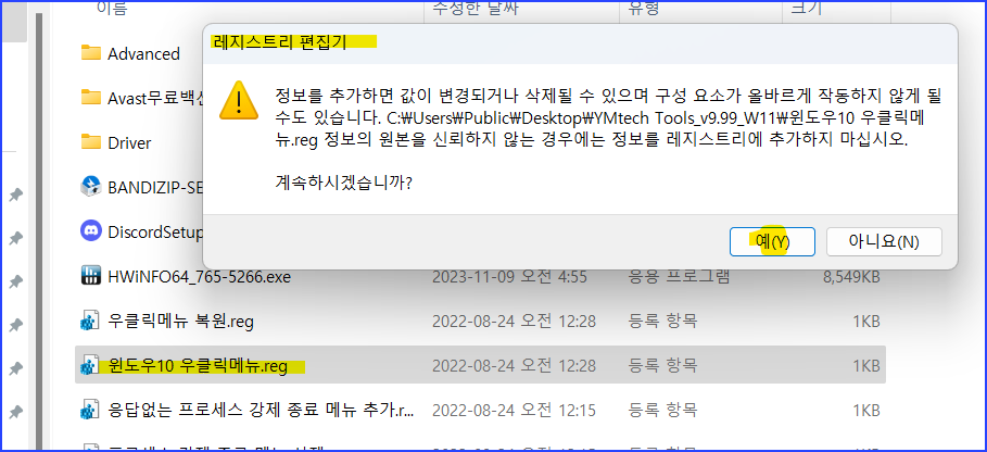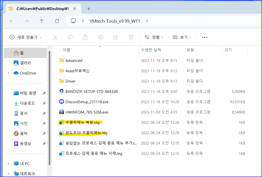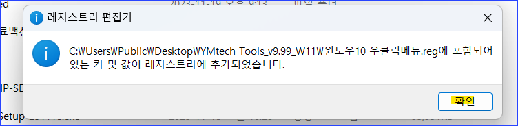 3) 이 우클릭 메뉴를 윈10처럼 변경이 가능하도록 해 주는 레지스트리 설정파일을 YMtech폴더에 넣어 놨습니다.