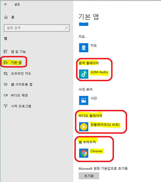 14. 다시시작 후 환경설정에서 기본앱 설정을 확인 하면, 커스텀 작업시 설정한 기본앱 설정이 그대로 복구되어 있는 것을 확인 할 수 있습니다.