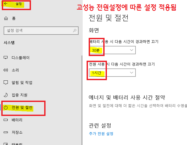 25. 설정-전원 및 절전 기능을 확인해 보시면, 화면끄기 시간이 아래와 같이 설정 되어있습니다.