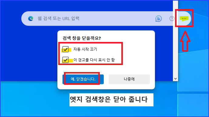 20. 화면 중앙에 뜨는 엣지 검색창은 닫아 줍니다.