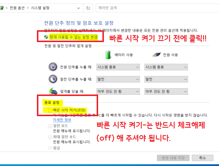 27. 가장 중요한 설정입니다-빠른 시작 켜기 체크해제! ! 필수!!