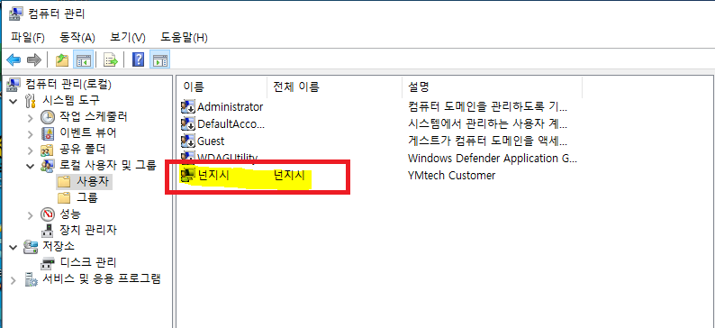 컴퓨터관리-사용자이름이 변경된 것을 볼 수 있습니다.