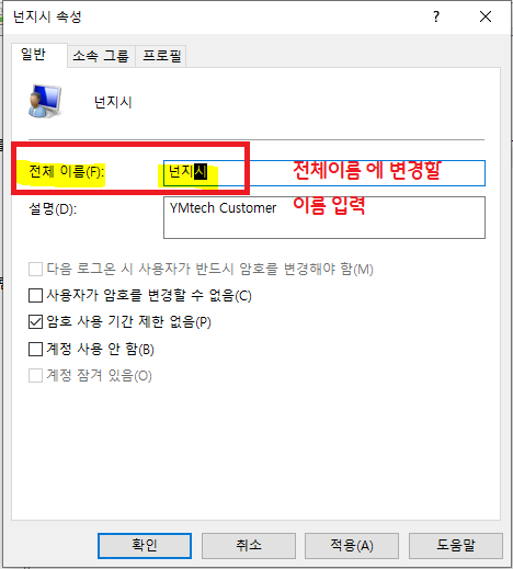 속성창에서 전체이름을 변경할 이름으로 입력한 후 확인을 클릭 합니다.