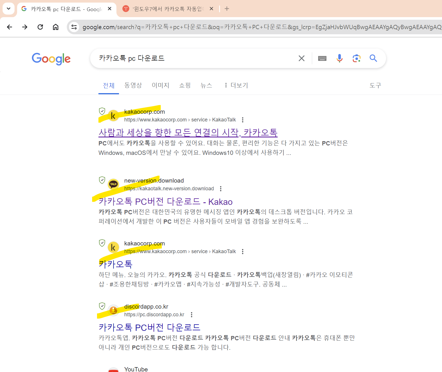 구글에서 검색하면 카카오톡 PC 버전 다운 사이트가 여러개가 나옵니다.