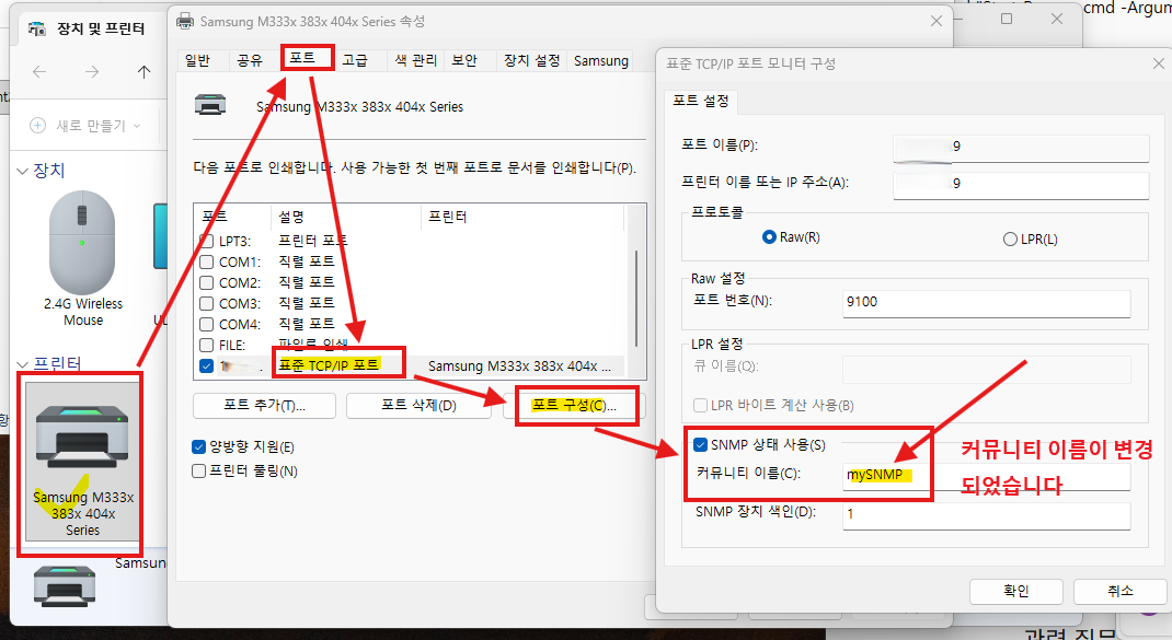 프린터 드라이버에서 사용중인 네트워크 포트를 찾고 기본 커뮤니티 이름인 public가 있으면 mySNMP로 변경하도록